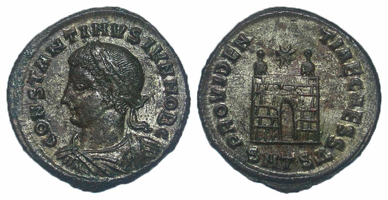 Constantine II. As Caesar, A.D. 317-337. Æ 3 (19.0 mm, 3.03 g, 12 h). Thessalonica, A.D. 326-328. CONSTANTINVS IVN NOB C, laureate, draped and cuirassed bust left / PROVIDENTIAE CAESS, campgate with two turrets and one star above, SMTSΔ in exergue. RIC 157; LRBC 815. gVF, silvered.