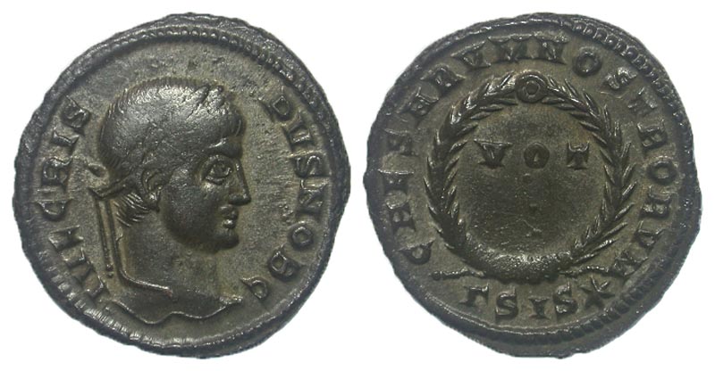 Crispus. Caesar, A.D. 317-326. Æ 3 (18.5 mm, 3.18 g, 11 h). Siscia, A.D. 320-321. IVL CRISPVS NOB C, laureate, draped and cuirassed bust right / CAESARVM NOSTRORVM around VOT V within wreath; ΓSIS* in exe. RIC 161. gVF.