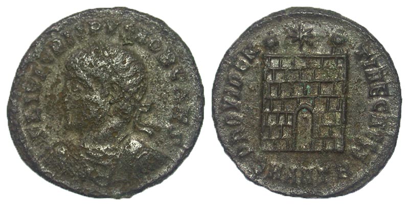 Crispus. Caesar, A.D. 317-326. Æ 3 (19.5 mm, 2.97 g, 11 h). Antioch, A.D. 325-326. FL IVL CRISPVS NOB CAES, laureate and cuirassed bust left / PROVIDENTIAE CAESS, camp gate with two turrets, one star above; SMANTB in exe. RIC 64; LRBC 1335. Fine.