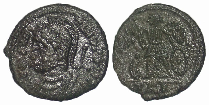 City Commemorative - Barbarous. A.D. 330-354. Æ 3/4 (14.3 mm, 1.3 g). Barbarous mint. CONSTANTINOPOLIS, laureate and helmeted bust of Constantinople left, wearing imperial cloak, scepter over shoulder / Victory standing left, foot on prow, holding scepter and resting hand on shield; TRP in exergue. VF.
