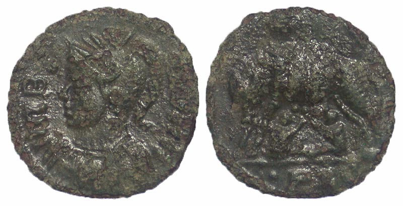 City Commemorative - Barbarous. A.D. 330-354. Æ 3/4 (13.7 mm, 1.00 g). Barbarous mint. VRBS ROMA, crested and helmeted bust of Roma left wearing imperial mantle / she-wolf standing left, suckling Romulus and Remus, two stars above; ·PLC in exergue. aVF.
