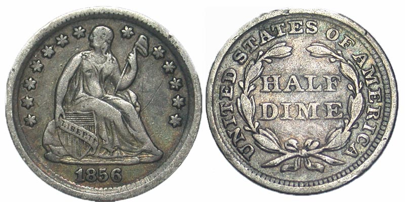 United States of America. 1856. Half Dime (15.3 mm, 1.23 g, 6 h). Philadelphia. Seated Liberty. Liberty seated right, 13 stars around, 1856 below / UNITED STATES OF AMERICA, around HALF DIME within wreath. VF-20, Toned.