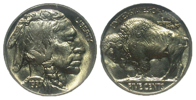 United States of America. 1937. 5 cents (Philadelphia. Buffalo Nickel. LIBERTY, 1937, portrait of Native American man right / UNITED STATES OF AMERICA, E PLURIBUS UNUM, FIVE CENTS, bison standing left. MS-66, golden luster.