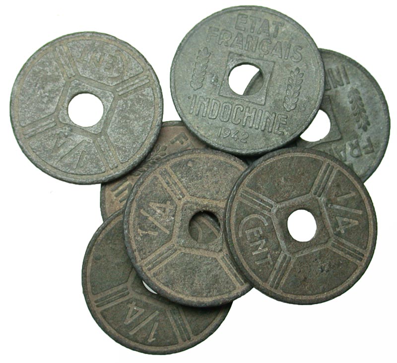 Lot of 7 French Indo-China coins. ETAT FRANCAIS INDOCHINE 1942, 1/4 CENT.