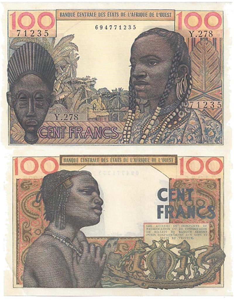 Lot 7-337. West African States, 100 Francs, 1959. XF, crisp.