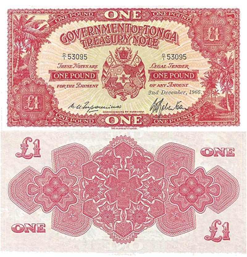 Lot 7-343. Tonga, 1 Pound, 1966. XF, crisp.