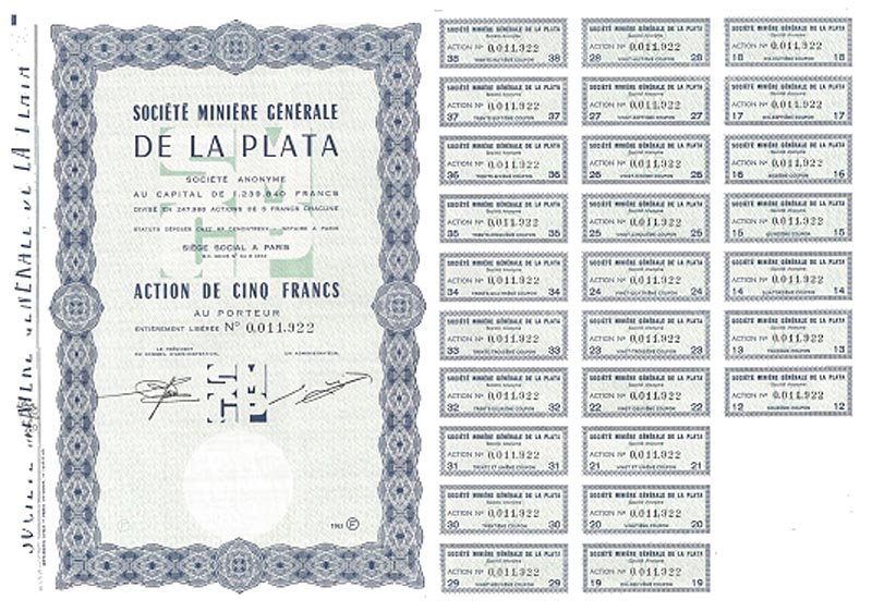 Bonds: France, 1963. Societe Mineire Generale De La Plata, 5 Francs. VF, clean.