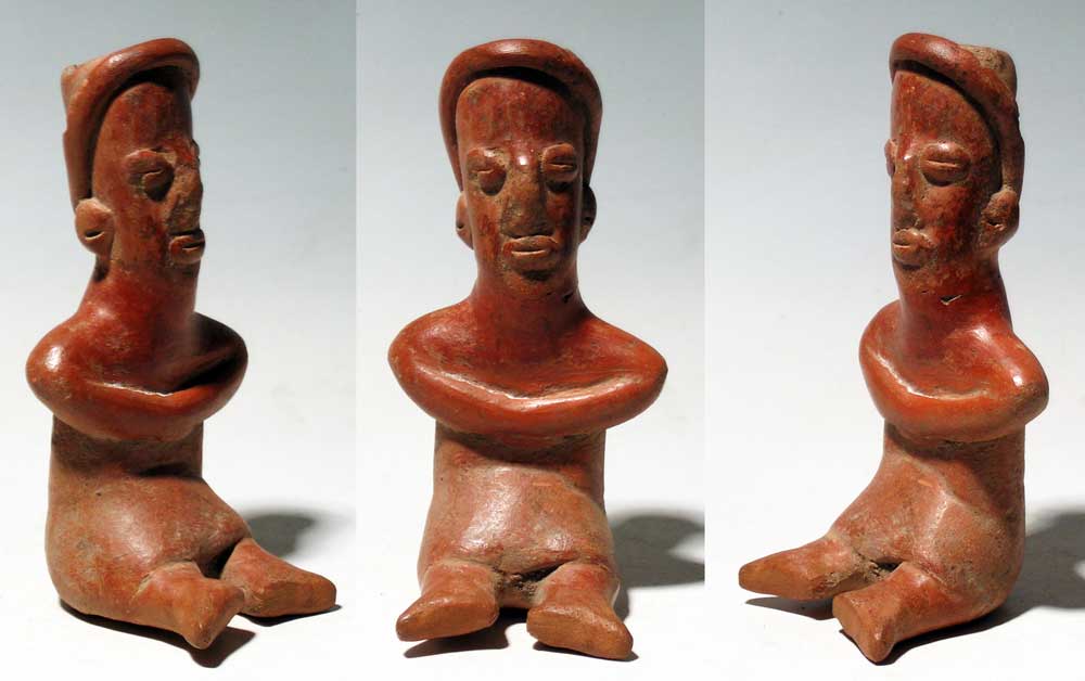 Seated Female Colima Figure. A choice Colima figure from West Mexico, ca. 300 BC – 300 AD. This seated female is 5-1/2” high and is depicted wearing a long skirt and simple headdress. Intact, with good mineral deposits showing on the highly burnished red slip. Ex Arnold colletion. Value range $310 - $450.
