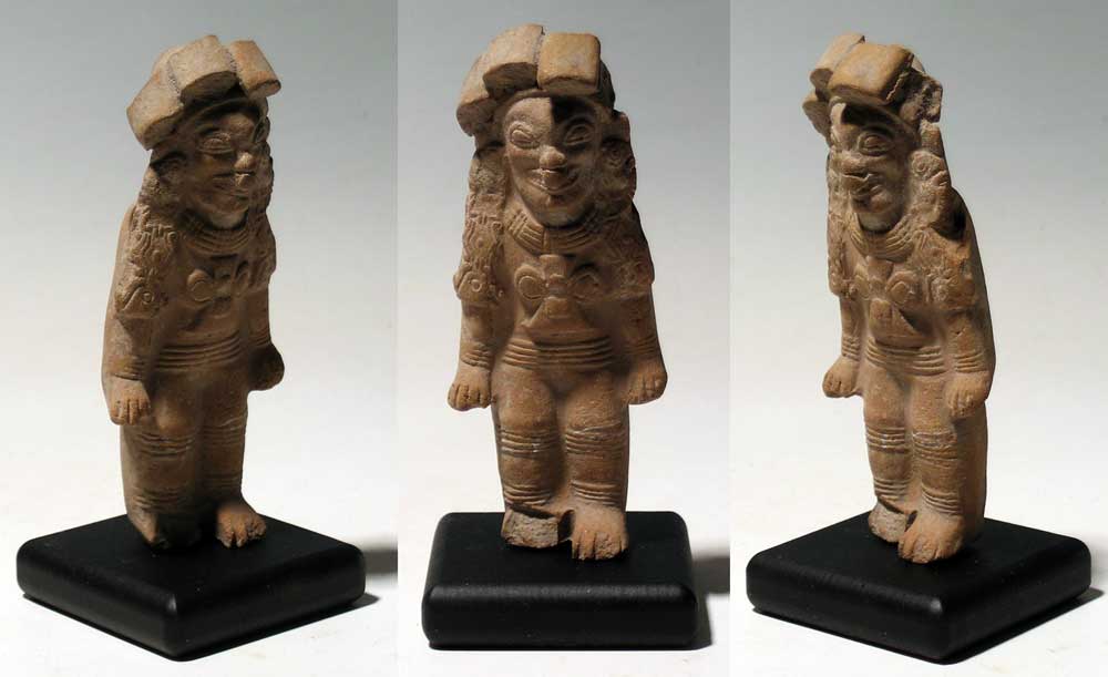 Jamacoaque Standing Shaman. A beautifully detailed Jamacoaque figure from Ecuador, ca. 300 BC – 400 AD. This fine Chone style figure is 4” tall and depicts a standing shaman in ornate ceremonial attire. He is wearing a complex headdress, multiple necklaces with large pectoral and intricately detailed ear ornaments flowing over his shoulders. Good mineral deposits, mounted on stand. Ex Rodriguez estate. Value range $310 - $450.