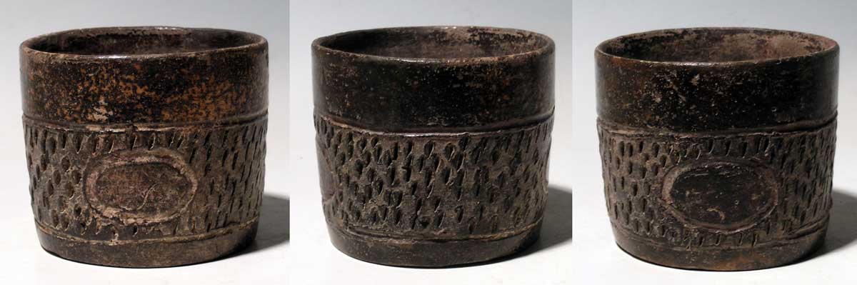 Maya Jar with Glyphic Symbols. A fine Maya jar from the Pacific slope region of Guatemala, ca. 400 – 700 AD. It is 3-3/4” in diameter and is decorated with a pair of deeply incised glyphic symbols set off with punctured slits, which create a fine visual texture. The rim retains remnants of orange pigment. Highly burnished, strong mineral deposits, hidden stress crack. Ex Tribal Treasures Gallery. Value range $560 - $650.