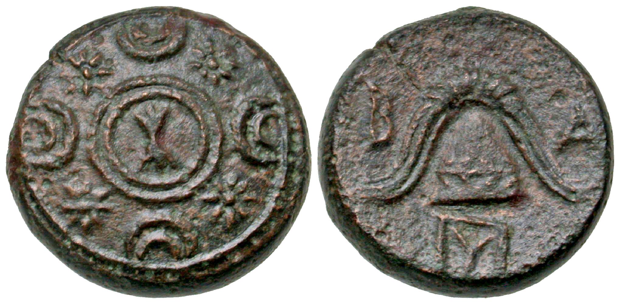 Macedonian Kingdom. Successors of Alexander III. 325-310 B.C. AE 16 "unit" (15.7 mm, 4.41 g, 3 h). Macedonian shield with thunderbolt in its center, surrounded by four crescents with rosettes between each / B-A to left and right of laureate Macedonian helmet without ear-flaps, ΠY monogram beneath. Cf. Liampi 69-70. Good VF, well-centered and struck, reverse somewhat porous, reddish-brown patina.