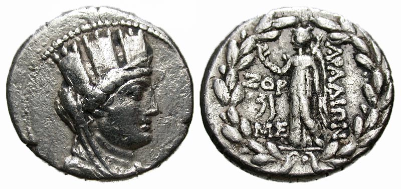 Phoenicia, Arados. 137-45 B.C. AR tetradrachm (27.7 mm, 15.00 g, 11 h). Dated year 177 = 83/2 B.C. Turreted, draped and veiled bust of Tyche right / APAΔIΩN, Nike standing left, holding aphlaston and palm; ZOP / Phoenician letter / MΣ to left. BMC 239; SNG Cop 52. aVF.