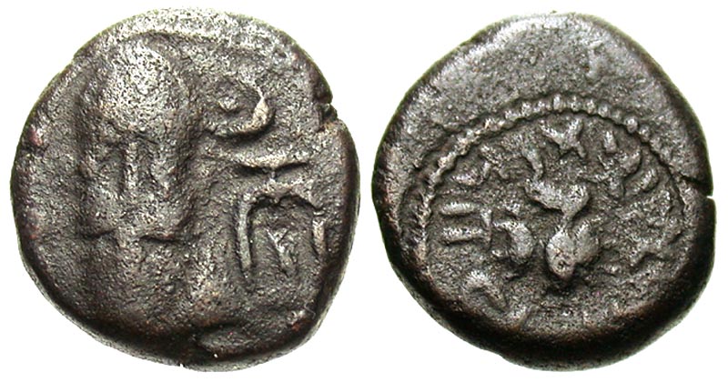 Elymaian Kingdom. Orodes II. Early-mid 2nd century A.D. Æ drachm (14.9 mm, 3.84 g, 12 h). Scarce. Bearded bust facing, wearing a diadem tiara. Pellet and crescent above an anchor, with one bar, to the right / Full-faced bust of Belos with horns on forehead. Circular legend around, urud malka bari urud (King Orodes, Son of Orodes). van't Haaff 13.2.1-2B; de Morgan 44; Alram 478. Fine.