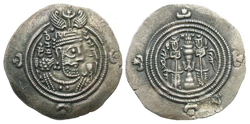 Lot 9-070. Sasanian Kingdom. Khusru II. A.D. 591-628. AR drachm. BISh (Bishapur) mint, RY 38.