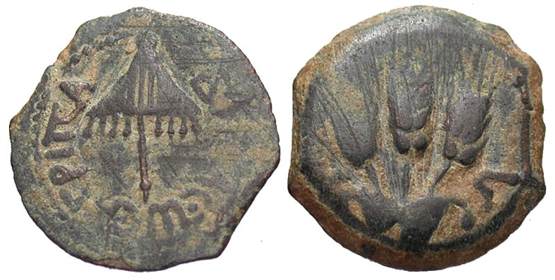 Lot 9-091. Agrippa I. 37-43 C.E. Æ prutah. Jerusalem mint, Year 6= 41-42 C.E..