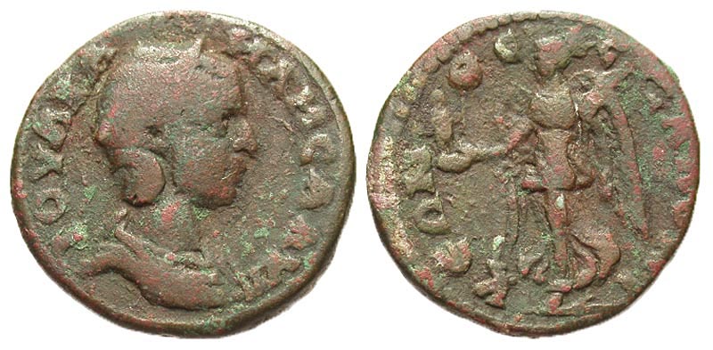Macedon, Thessalonica. Julia Mamaea. Augusta, A.D. 222-235. Æ 24 (24 mm, 8.81 g, 2 h). IOVΛIA MAMEA AVΓ, diademed and draped bust right / ΘEΣΣAΛONIKEΩN, Nike advancing left, holding Kabeiros and palm. Varbanov 4484; BMC 108; Touratsoglou 32. Fine.