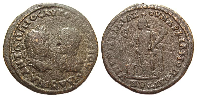 Moesia Inferior, Marcianopolis. Caracalla. A.D. 198-217. Æ pentassarion (28.0 mm, 10.94 g, 1 h). Quintilianus, consular legate, A.D. 215. ANTΩNINOC AVΓOVCTOC IOVΛIA DOMNA, laureate head of Caracalla right facing draped bust of Domna left / YP KYNTIΛIANOY MAPKIANOΠOΛITΩN, Homonoia standing left, holding patera over altar and cornucopia; Є in left field. AMNG 677; Varbanov 1030; H&J 6.19.36.9. Fine.