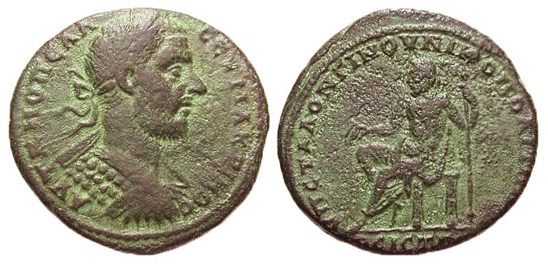 Moesia Inferior, Nicopolis ad Istrum. Macrinus. A.D. 217-218. Æ tetrassarion (27.1 mm, 10.32 g, 7 h). A.D. 217-218. Statius Longinus, magistrate. AVT K M OΠEΛ CEV MAKPEINOC , laureate and cuirassed bust right / VΠ CTA ΛONΓINOV NIKOPOΛITΩN ΠPOC ICTP, Zeus seated left, holding patera and scepter. AMNG 1723; Varbanov 3484; H & J 8.23.1.9 var (cuirassed bust). aVF, green patina.