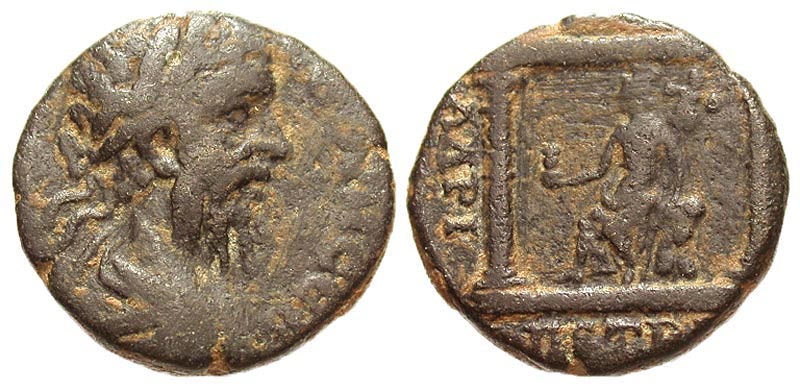 Arabia Petraea, Petra. Septimius Severus. A.D. 193-211. Æ 20 (20 mm, 7.95 g, 12 h). ΛOY CEΠT CEOVH ΠOCCEB, laureate, draped, and cuirassed bust right / ADPI ΠETPA MHT, Tyche seated left within distyle shrine, holding a small stele and trophy, cuirass behind seat. SNG ANS 1369; Spijkerman 33-34; Mionnet 46. aVF, Rare.