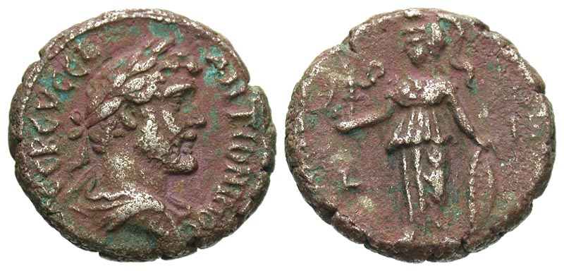 Egypt, Alexandria. Antoninus Pius. A.D. 138-161. BI tetradrachm (23 mm, 12.95 g, 11 h). Year 13=A.D. 149/50. ANTωNINOC CEB EVCEB, laureate and draped bust right / L-IΓ, Athena standing left, holding Nike and resting left hand on shield. Curtis 579; Milne -; Emmett 1365. VF, red patina.