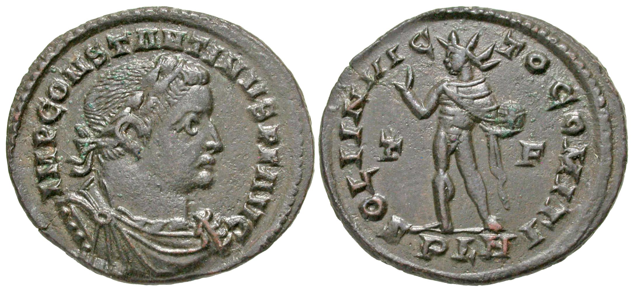 Constantine I. A.D. 307/10-337. AE follis (24.2 mm, 4.10 g, 6 h). London mint, struck A.D. 310. IMP CONSTANTINVS P F AVG, laureate, draped and cuirassed bust of Constantine I right / SOLI INVICTO COMITI, naked and radiate Sol standing left, chlamys across shoulders, raising right hand and holding globe; T-F in fields, PLN in exergue. RIC 122; CT 6.02.011. Nearly As Struck!, dark brown patina.