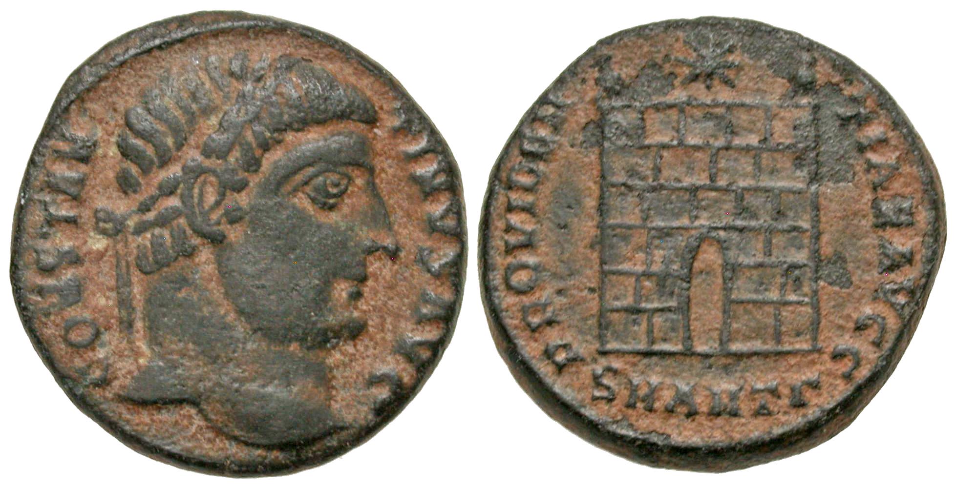 Constantine I. A.D. 307/10-337. AE follis (18.6 mm, 3.75 g, 11 h). Antioch mint, struck A.D. 325-326. CONSTANTINVS AVG, laureate head of Constantine I right / PROVIDENTIA AVGG, camp gate with two turrets, star above; SMANTĪ in exergue. RIC 63; LRBC 1333. VF, black patina with red highlights.
