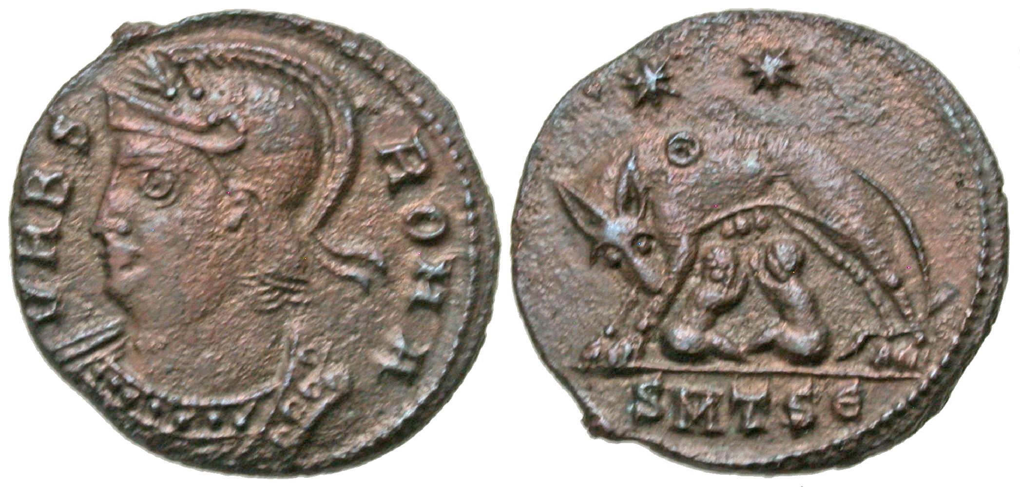 City Commemorative. A.D. 330-354. AE reduced follis (16.4 mm, 1.59 g, 7 h). Thessalonica mint, struck A.D. 330-333. VRBS ROMA, crested and helmeted bust of Roma left wearing imperial mantle / she-wolf standing left, suckling Romulus and Remus, two stars above; Θ on shoulder; SMTSЄ in exergue. RIC 187 var. (symbol); LRBC 838 var. (same). VF, cleaned. Scarce variety.