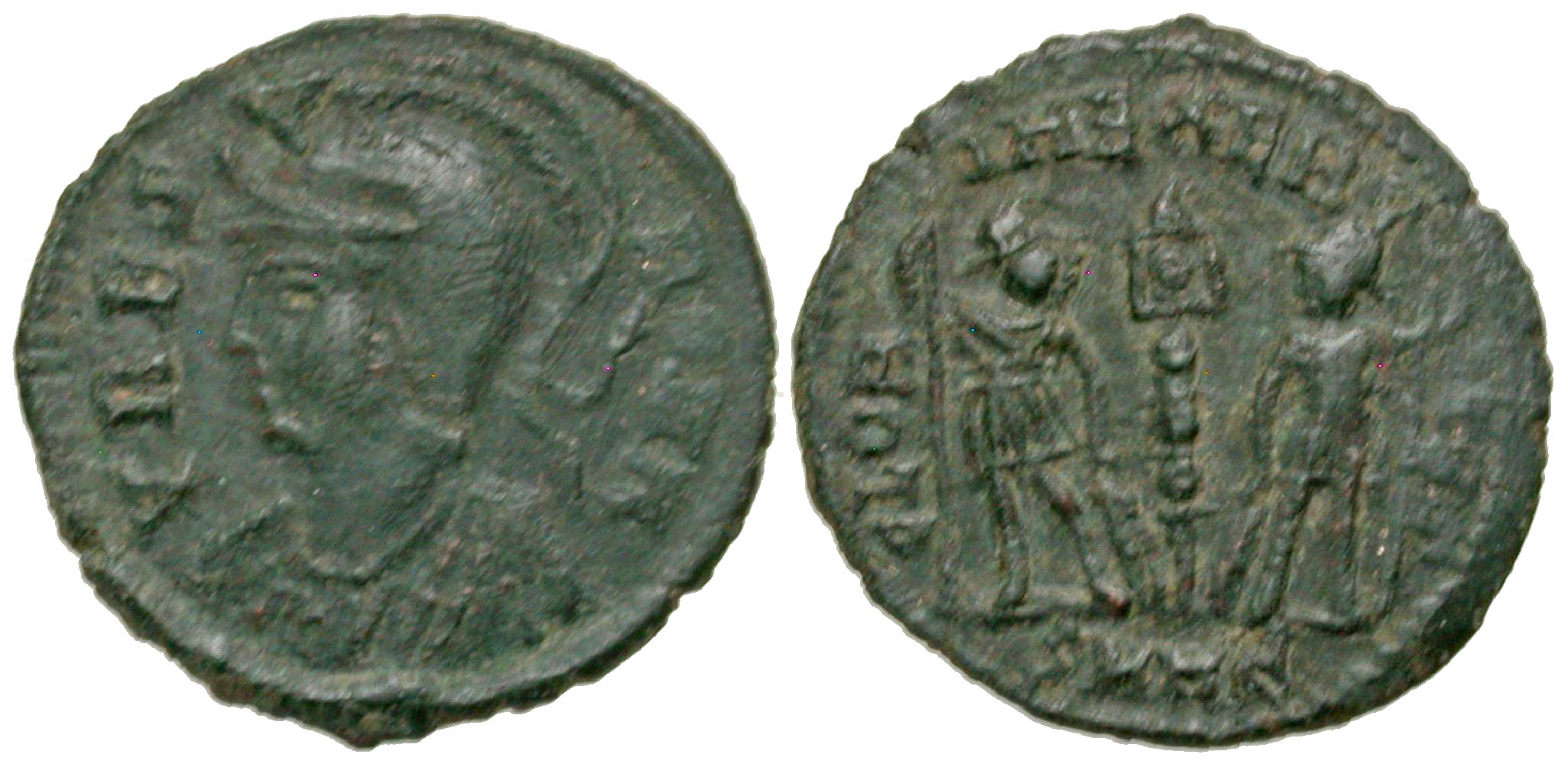City Commemorative . A.D. 330-354. AE reduced follis (16.7 mm, 1.34 g, 5 h). Heraclea mint, struck A.D. 336-337. VRBS ROMA, crested and helmeted bust of Roma left wearing imperial mantle / GLORIA EXERCITVS, two soldiers, holding spears, standing front, heads turned inward, hand on shield, one standard between them; SMHЄ in exergue. RIC 156; LRBC 941. VF, light deposits.