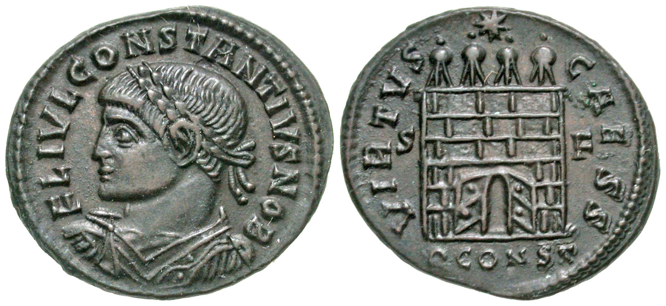 Lot 651. Constantius II. As Caesar, A.D. 324-337. AE follis. Arles mint, struck A.D. 328. Scarce.