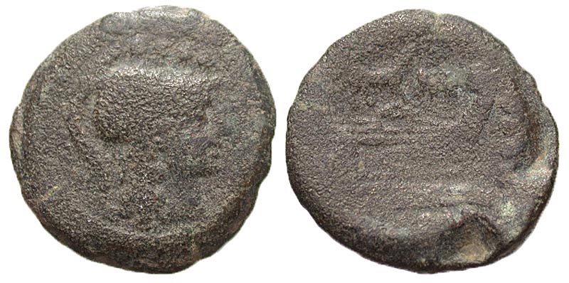 Anonymous. 169-158 B.C. Æ triens (24.5 mm, 11.71 g, 7 h). Rome mint. Helmeted head of Minerva right, four pellets above / ROMA, prow of galley right; four pellets to right, ass standing right above. Crawford 195/3; Sydenham 298b. aFine.