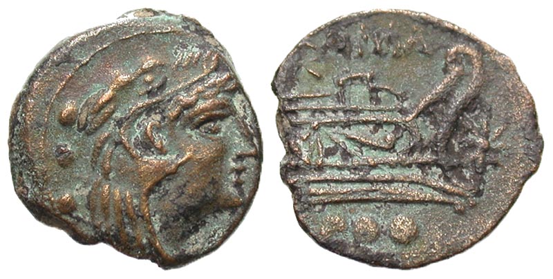 Anonymous. 169-158 B.C. Æ quadrans (16.9 mm, 3.53 g, 9 h). Rome mint. Head of Hercules right, wearing lion's-skin headdress; three pellets behind / ROMA, prow of galley right; star to right, three pellets below. Crawford 196/4; Sydenham 264d. VF, green highlights.