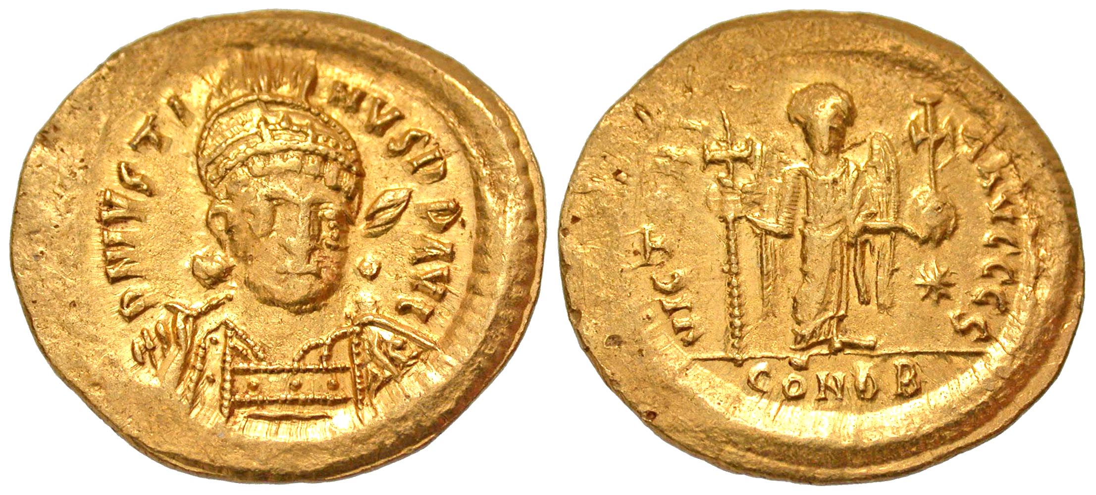 Justin I. 518-527. AV solidus (21.5 mm, 4.50 g, 6 h). Constantinople mint, struck 519-527. D N IVSTINVS P P AVG, helmeted and cuirassed bust of Justin I facing, holding spear and shield / VICTORIA AVGGGς, Angel standing facing, holding long cross and globus cruciger, star to right; CONOB in exergue. SBV 56; DOC 2f; MIB 3. VF, slightly wavy flan resulting in areas of uneven wear.