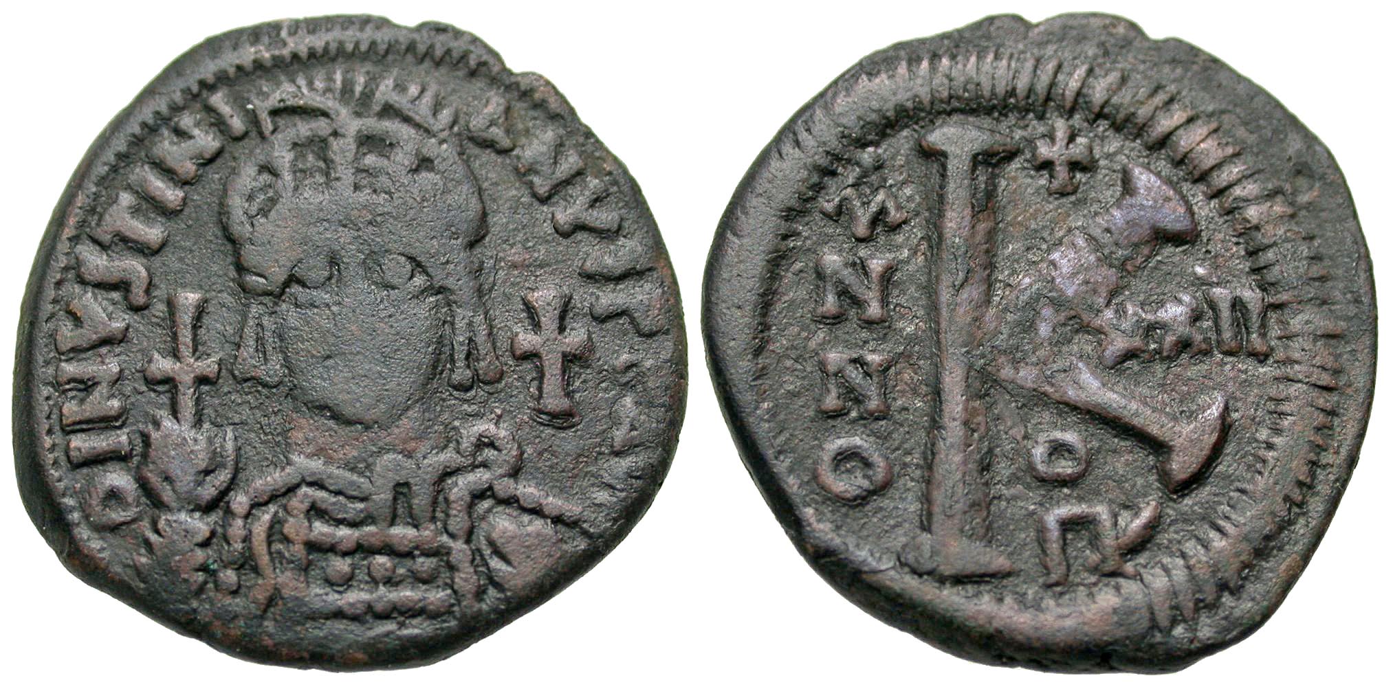 Lot 708. Justinian I. 527-565. AE half follis. Antioch mint, dated RY 22 = 548/9. Scarce.