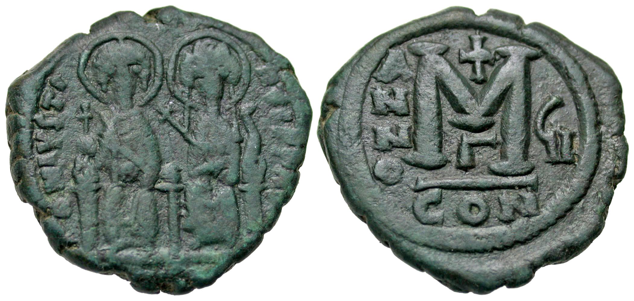 Justin II. 565-578. AE follis (29.1 mm, 12.67 g, 12 h). Constantinople mint, dated RY 7 = 571/2. D N IVSTINIANVS P P AV, Justin II and Sophia seated on throne facing, both nimbate; he holds a globus cruciger while she holds a cruciform scepter, cross in field between their heads / Large M, ANNO to left, cross above, ςI (date) to right, Γ below; CON in exergue. SBV 360; DOC 32c; MIB 43. aVF, dark green patina. Very Rare.