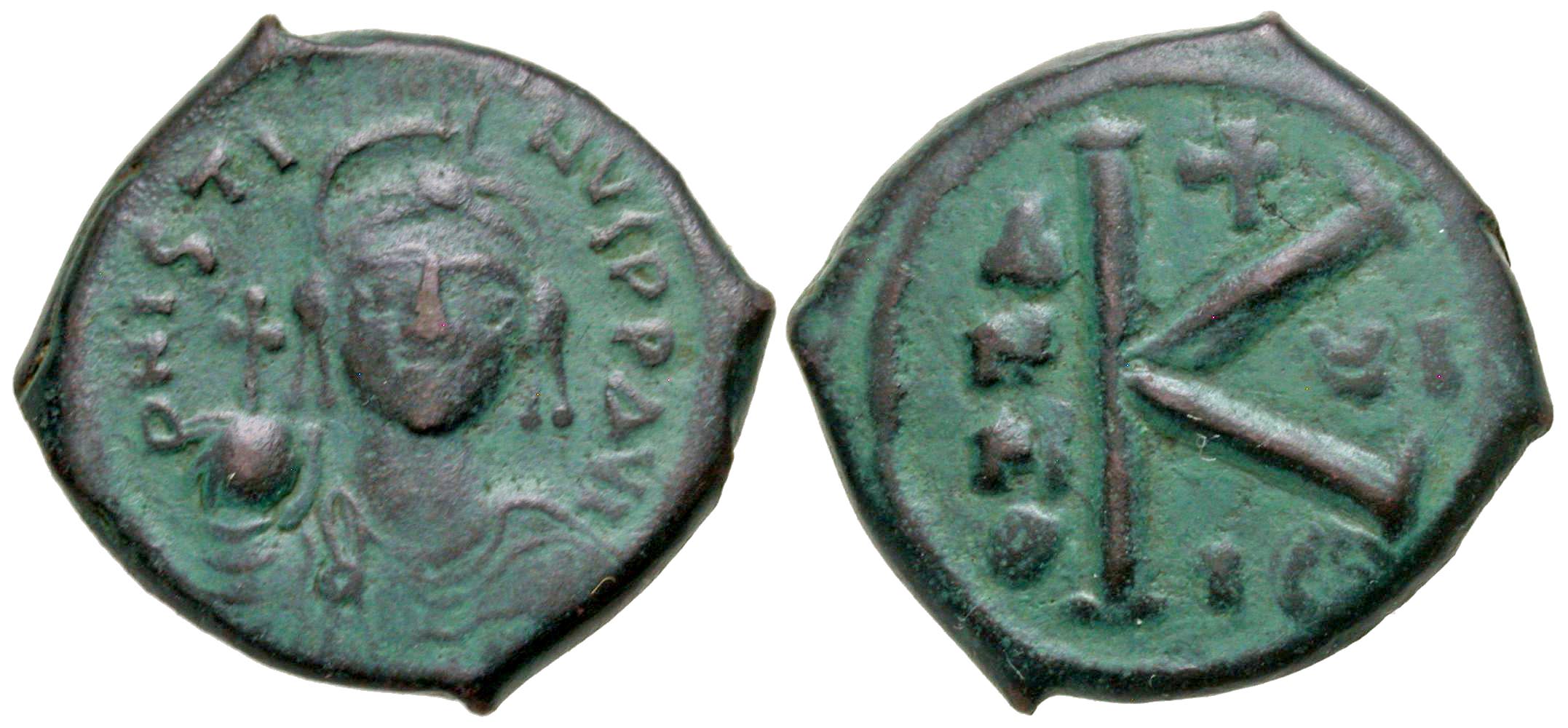 Lot 713. Justin II. 565-578. AE follis. Thessalonica mint, dated RY 7 = 571/2. Rare.