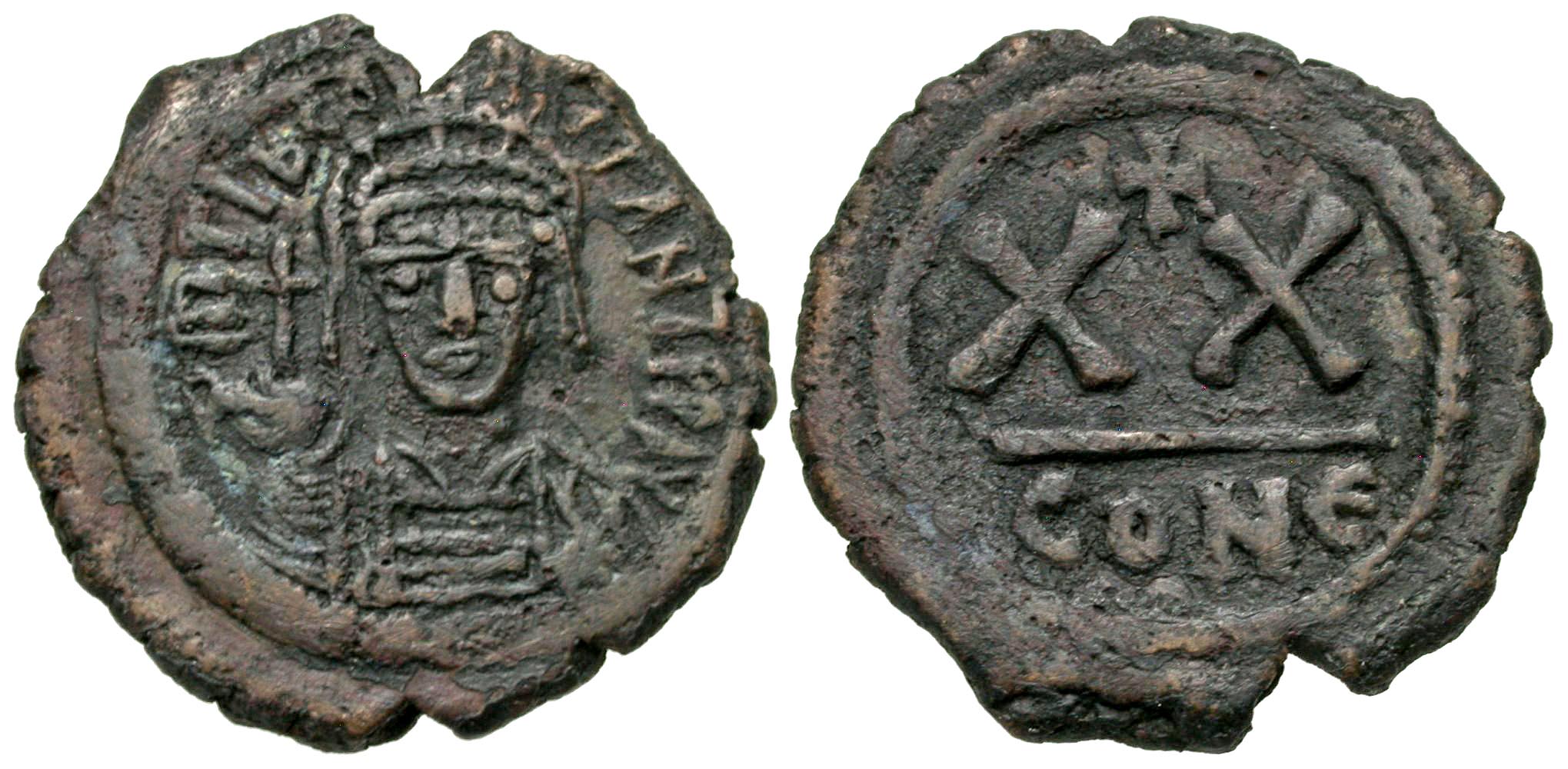 Tiberius II Constantine. 578-582. AE half follis (24.9 mm, 6.28 g, 7 h). Constantinople mint, struck 579-582. Dm TIb CONSTANT P P AV, helmeted and cuirassed bust of Tiberius II Constantine facing, holding globus cruciger and shield / Large XX; cross above; CONŠ in exergue. SBV 434; DOC 17e; MIB 30. VF, flan chip.