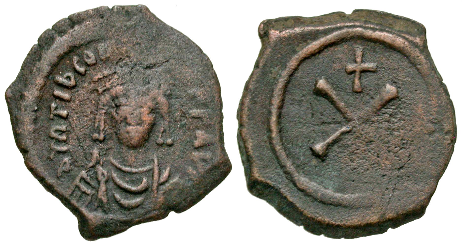 Lot 718. Tiberius II Constantine. 578-582. AE decanummium. Constantinople mint, struck 579-582. Scarce.