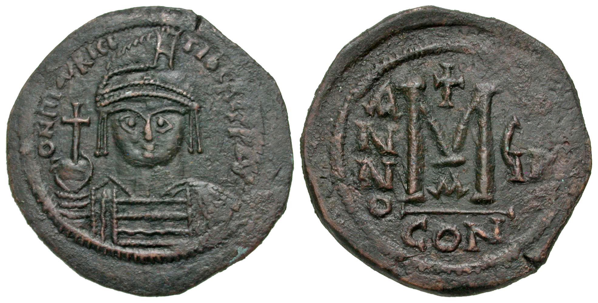 Lot 719. Maurice Tiberius. 582-602. AE follis. Constantinople mint, dated RY 7= 588/9.