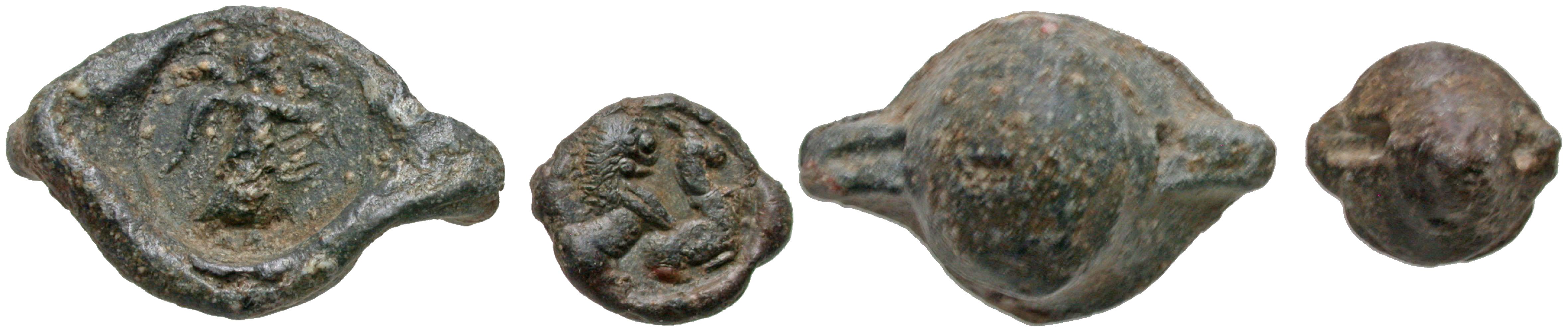 Lot of Two Lead Seals. Lot of Two Lead Seals. The first is a lion attacking an Oryx(?), probably Arabian or Perisan in origin, I would imagine it dates to the second century B.C. or thereabout. The second is Nike advancing left holding a wreath and palm, probably originating in Asia Minor or the Levant in the first or second centuries AD. I have little knowledge of seals so my ignorance may be your gain. Low opening bid.
