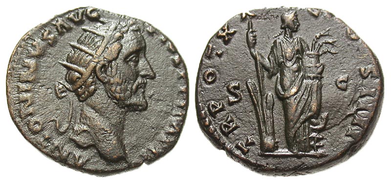 Antoninus Pius. A.D. 138-161. Æ dupondius (25.0 mm, 12.52 g, 11 h). Rome mint, A.D. 157. ANTONINVS AVG PIVS PP IMP II, radiate head right / TR POT XX COS IIII, S-C, Annona standing right, foot on prow, holding rudder and modius set on knee. RIC 969; BMCRE 2022. VF.