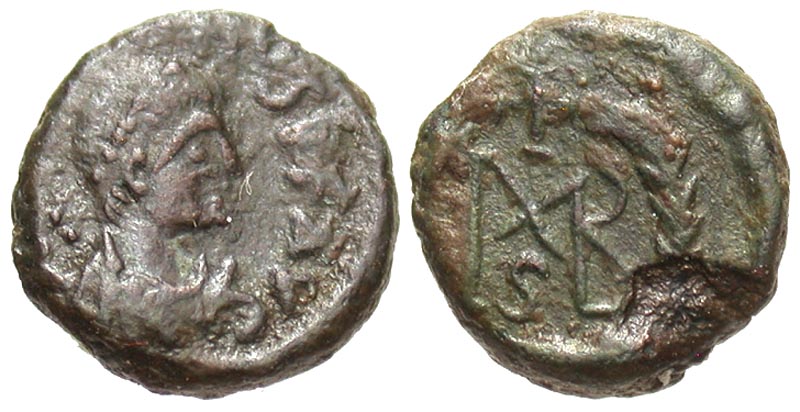 Marcian. A.D. 450-457. Æ 4 (10 mm, 1.40 g, 2 h). DN MARCIANVS P F AVG, pearl-diademed, draped, and cuirassed bust right / Monogram within wreath, cross above; uncertain mintmark. cf. RIC 545; cf. LRBC 2250. F/VF.