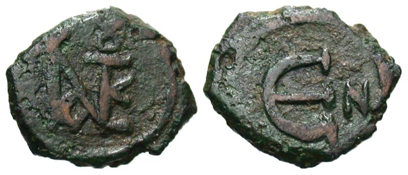 Justin II. 565-578. Æ pentanummium (15.2 mm, 2.13 g, 6 h). Nicomedia mint. Monogram 8 of Justin II / Large Є, N to right. SBV 371; DOC 116. VF.