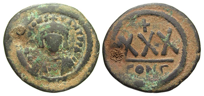Tiberius II Constantine. 578-582. Æ three-quarter follis (33.5 mm, 11.32 g, 6 h). Constantinople mint. d m TIb CONSTANT P P AVG, crowned, draped and cuirassed bust facing / Large XXX, cross above, CONΓ in exergue. SBV 432; DOC 15d. VF.