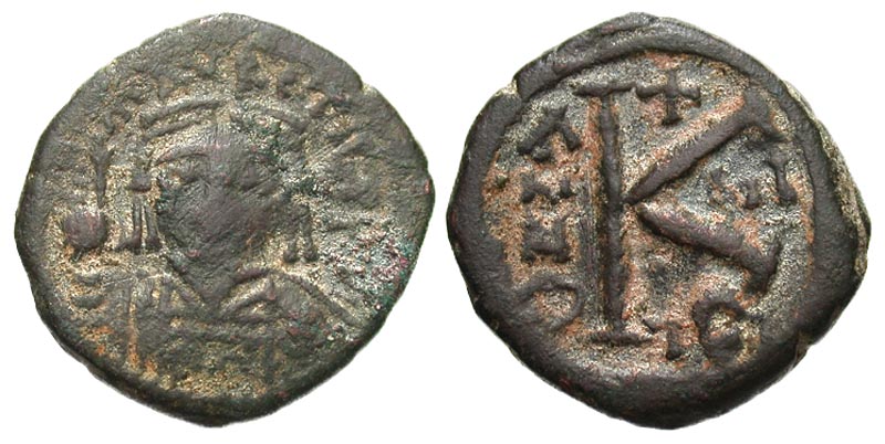 Lot 9-204. Maurice Tiberius. 582-602. Æ half follis. Thessalonica mint, year 5 = 587/8.