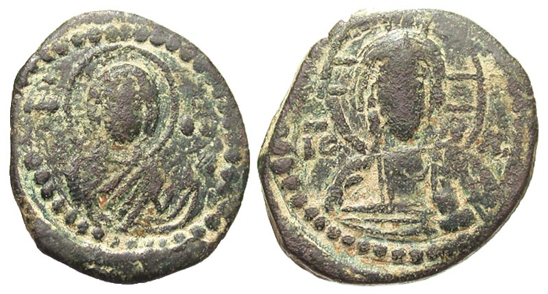 Anonymous (attributed to Romanus IV). Ca. 1068-1071. Æ "Class G" anonymous follis (26.8 mm, 7.68 g, 5 h). Constantinople mint. Bust of Christ facing with nimbate cross, pallium and colobium, and raising right hand in benediction, scroll in left hand / MP-ΘV, facing bust of the Virgin Mary, nimbate and wearing pallium and maphorium. SBV 1867; DOC p. 692-4. aVF, sandy patina.