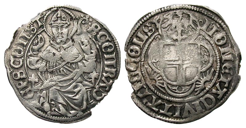 Germany, Konstanz. early 17th century AR Halbbatzen (22.7 mm, 1.51 g, 11 h). MONЄTA · CIVITATIS CONST, civic coat-of-arms of Konstanz within trilobe; eagle above / S CONRAD’ ЄPS · CONST, St. Conrad seated facing on throne, raising hand in benediction and holding crozier. Saurma 1615; Nau 18. aVF.