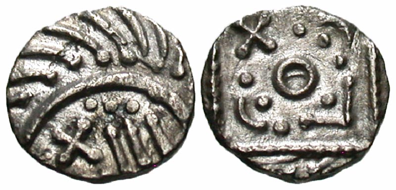 Lot 9-254. Anglo-Saxon, Early Period. ca. 600-775. AR sceatta. Frisia (Dorestad?) mint, 695-740. Continental series E, variety C.