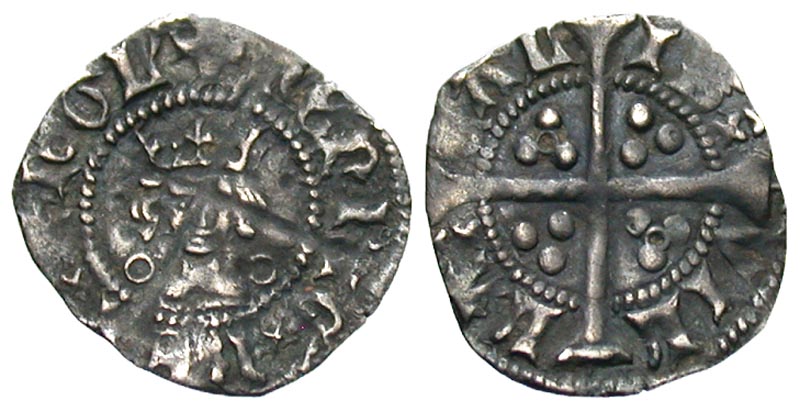 England, House of Lancaster. Henry VI. First reign, 1422-1461. AR half penny (15.2 mm, 0.45 g, 10 h). Calais mint, 1430-1431. HENRIC REX ANGL, crowned bust facing / VILLA CALIS, long cross, three pellets in each quadrant. SCBC 1871; North 1454. Toned VF.
