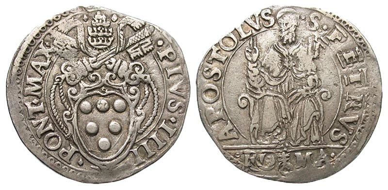 Italy, Papal States. Pius IV (Giovannangelo de'Medici). 1559-1565. AR testone (30.8 mm, 9.31 g, 1 h). Rome. ·PIVS· IIII· PONT· MAX, shield of arms with tiara above, crossed keys / APOSTOLVS ·S· PETRVS, ROMA, St. Peter seated facing, holding key and raising hand in benediction. Berman 1063; CNI XV 8. VF.