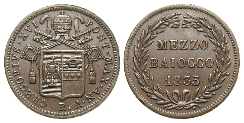 Italy, Papal States. Gregory XVI. 1831-1846. Æ half baicco (23.5 mm, 5.44 g, 12 h). Rare. ·GREGORIVS· XVI· PONT· MAX· AN·V R, Papal coat of arms / MEZZO BAIOCCO, 1835, within olive wreath. KM 1319; Berman 3292; CNI 80. EF.